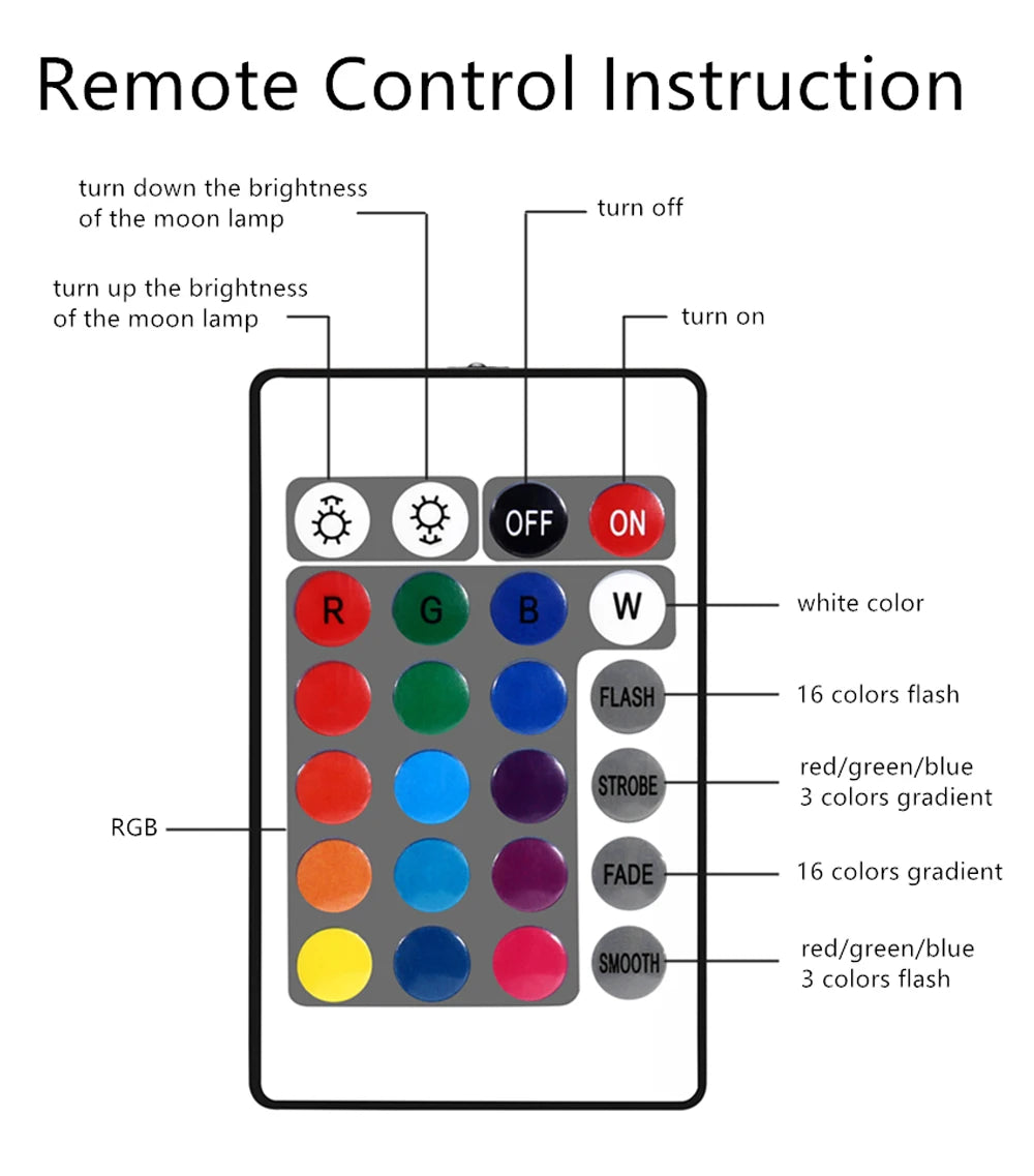 1. Touch the metal ring at the bottom of the moon lamp to turn on / off the light and change color.