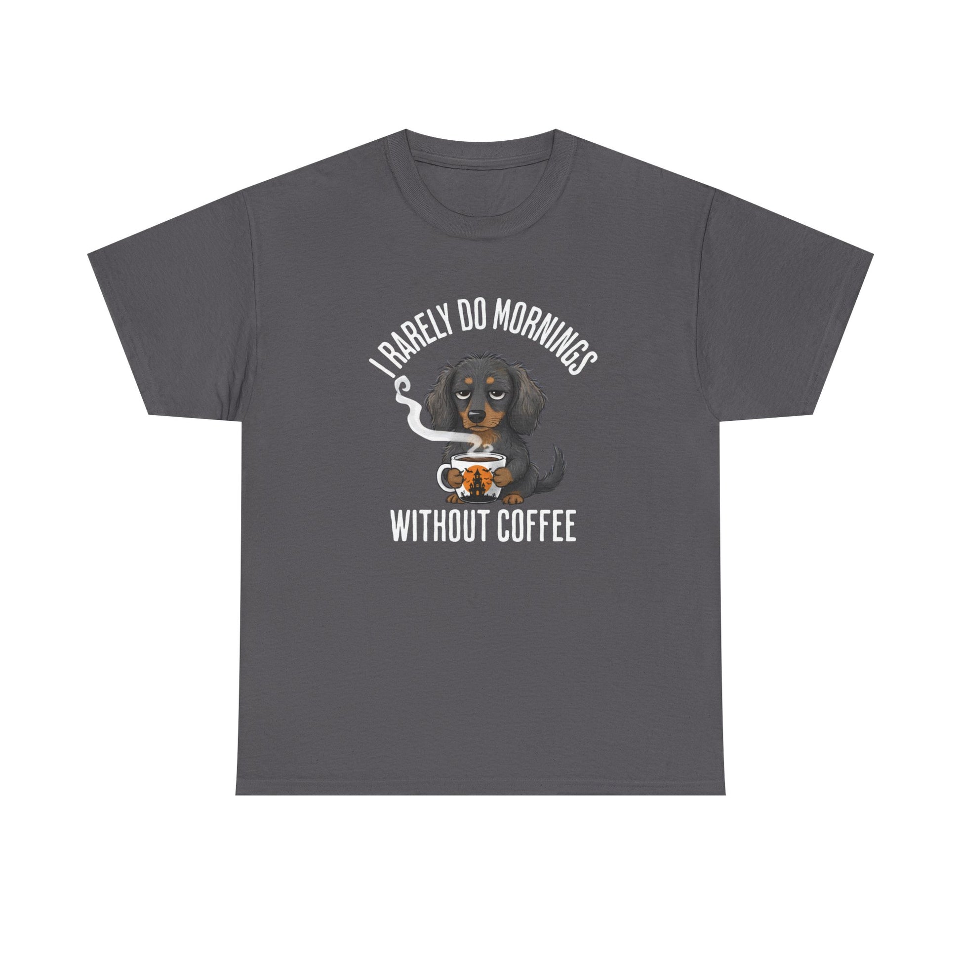 Coffee Lover Dachshund T-Shirt — "I Barely Do Mornings Without Coffee"