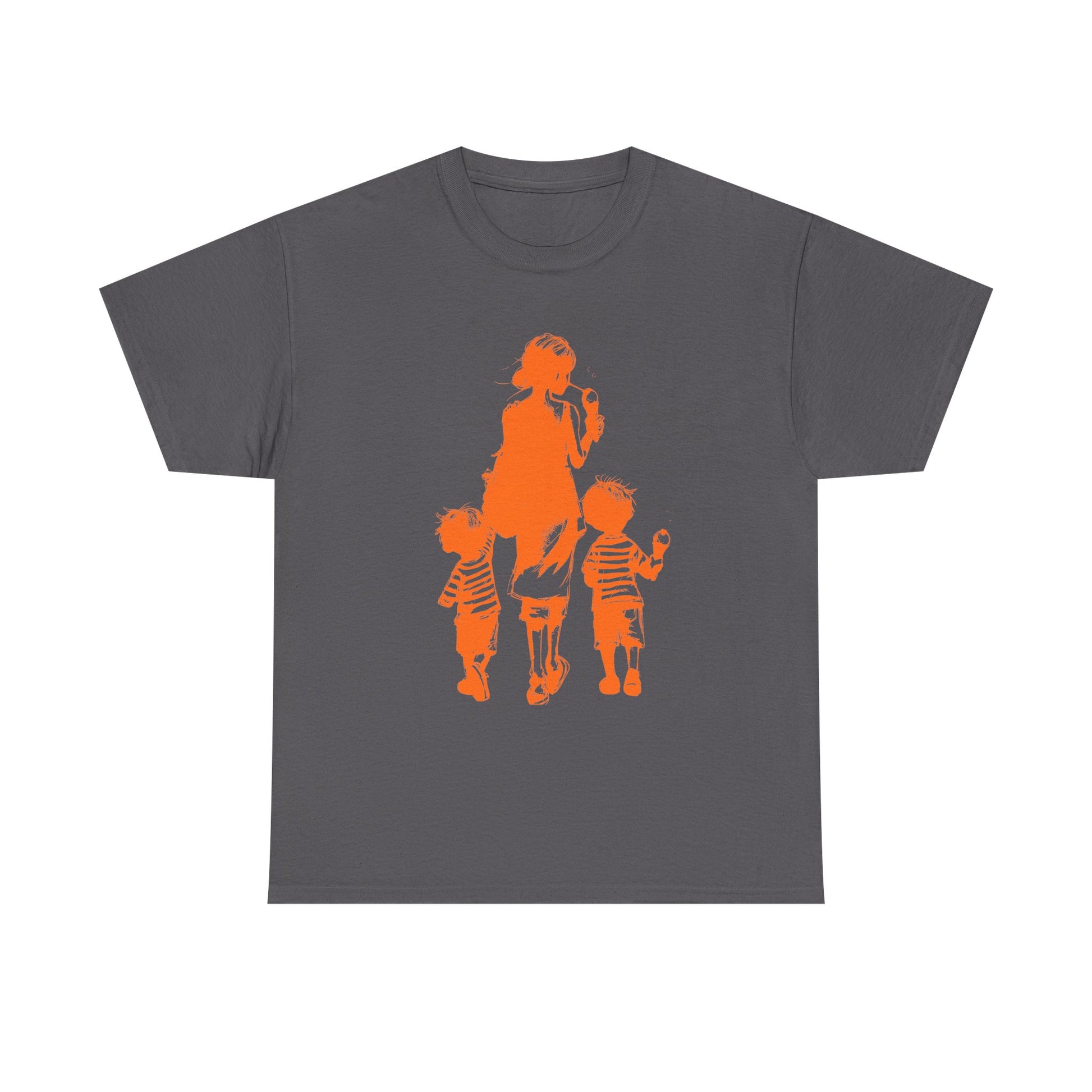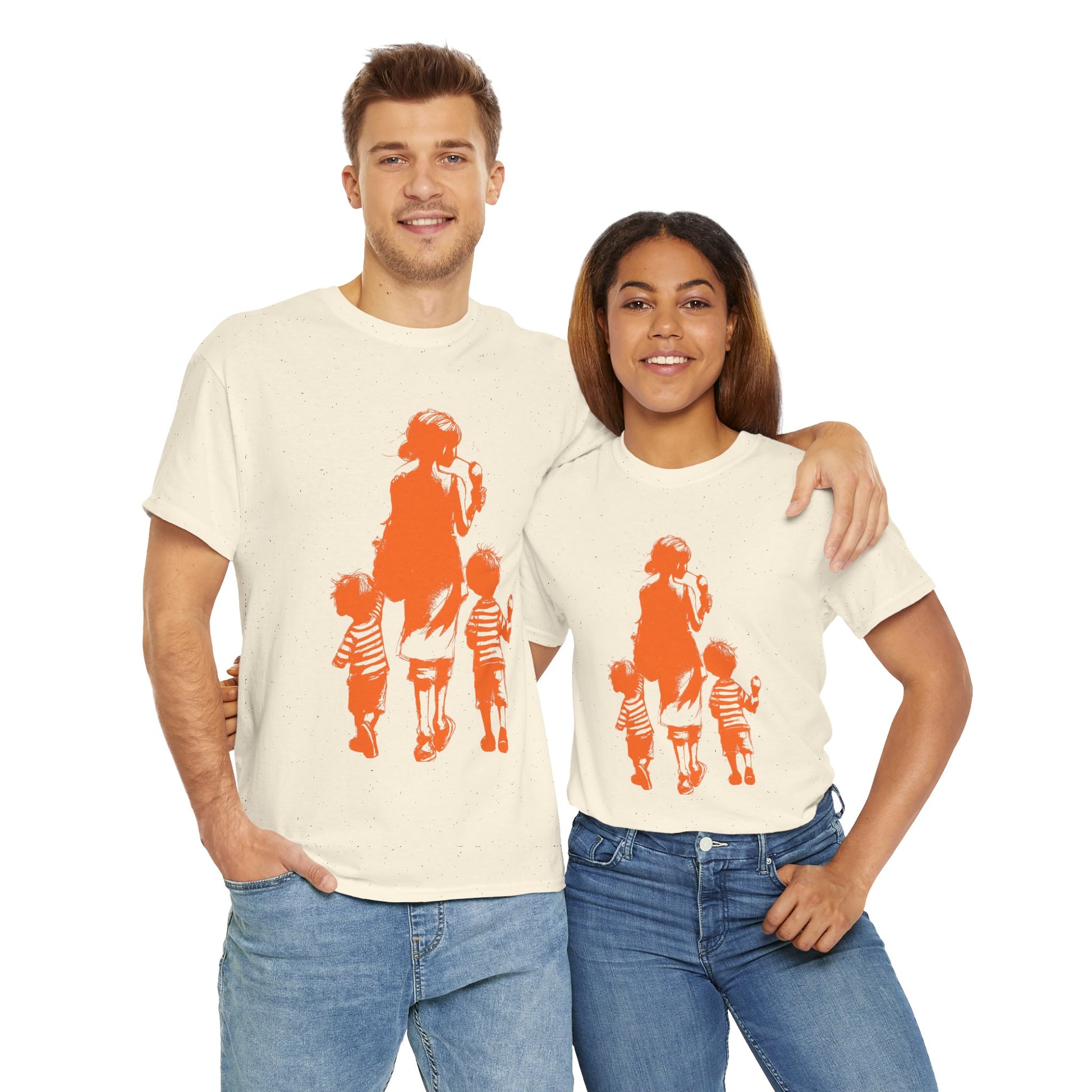 A unisex heavy cotton T-shirt featuring a design of a mom walking with twins and ice cream treats. This comfy and durable tee is perfect for parents of twins or for anyone who loves a fun and playful design. Ideal for Mother's Day, Father's Day, and family outings.