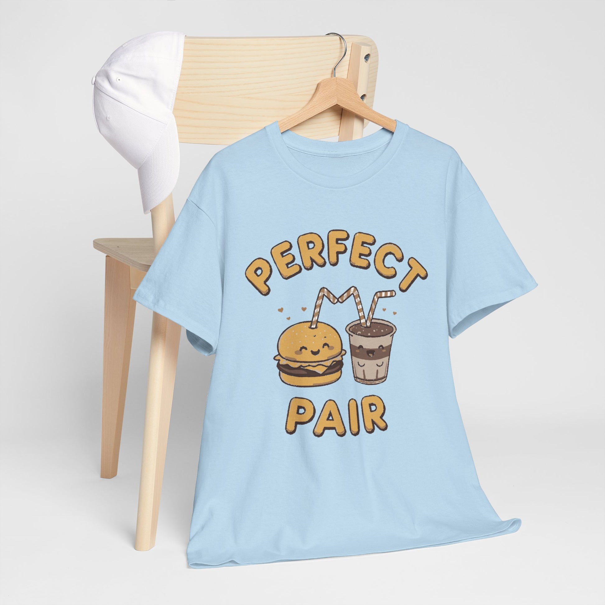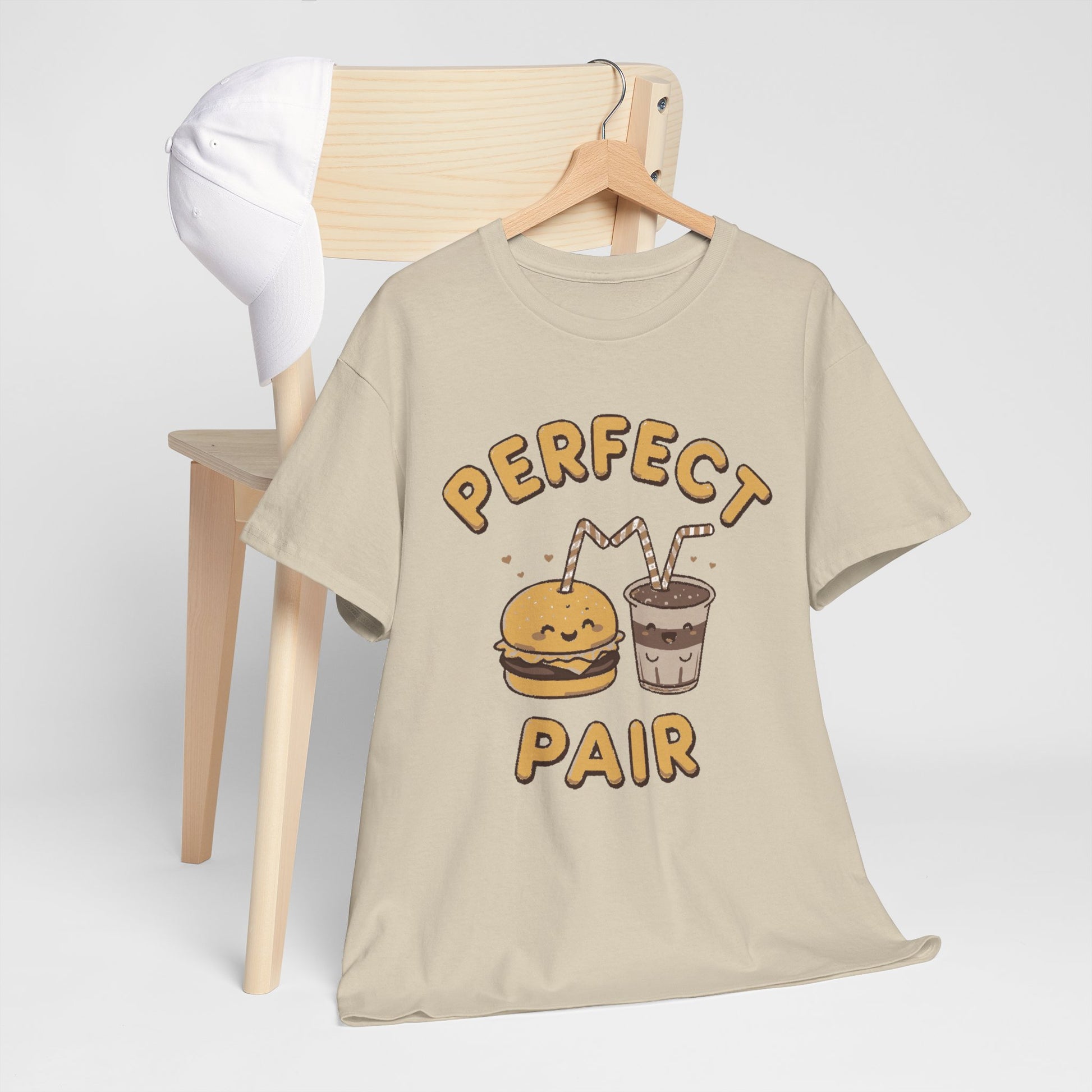 Soft, casual tee with a playful illustration of a smiling burger and milkshake sharing straws under the hand-lettered words “Perfect Pair.” The light, warm palette and slightly textured line work give it a cozy, retro snack-shop vibe—friendly, easygoing, and a little bit nostalgic. Wear it on relaxed days out, pairing it with jeans or shorts for a laid-back look that sparks a smile and starts conversations about favorite comfort foods and memory-filled diners.